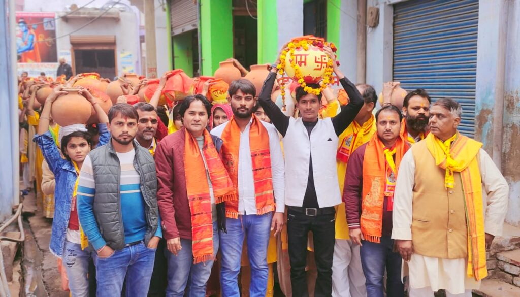 आगरा। आगामी 22 जनवरी को भगवान श्री राम की नगरी अयोध्या में प्रभु श्री राम की प्राण प्रतिष्ठा की जाएगी, इससे पूर्व राष्ट्रीय स्वयंसेवक संघ के बैनर तले आज ग्राम दूरा में विशाल कलश यात्रा पूरे गांव , बाजार में होकर निकाल गई। कलश यात्रा में शामिल सैकड़ों की संख्या में राम भक्त महिला पुरुषों का पुष्प वर्षा कर जोरदार स्वागत किया गया,बाजार में जय जय श्री राम के नारे,सुरक्षा की दृष्टि से चौकी प्रभारी अखिलेश कुमार पुलिस फोर्स सहित मौजूद रहे। ग्राम दूरा की पुलिस चौकी स्थित महादेव मंदिर से दोपहर एक बजे राम ,सिया ,लक्ष्मण के स्वरूपों की आरती उतार जिला प्रचारक जितेंद्र जी , जिला कारवाह प्रसांत कुमार , बजरंग दल विभाग संयोजक यदुवीर माहुरा तहसील प्रचारक भरत लाल , खंड कारवाह अरविंद चाहर ने कलश यात्रा की शुरुआत कराई ,कलश यात्रा में पीत वस्त्र धारण किए महिलाये बैंड बाजों की धुन पर चल रही थी, कलश यात्रा ग्राम में भ्रमण करती हुई महादेव मंदिर पहुंची , समापन के बाद प्रसाद वितरण हुआ कार्यक्रम में विशेष से बजरंग दल के आर के इंदौलिया , सांसद भाई प्रमोद चाहर , विपिन अग्रवाल ,ओमप्रकाश शुक्ला, होला पहलवान, यतेंद्र चाहर , प्रधान अनिल कहिरवार , शिशुपाल कटरा , प्रभात शुक्ला समेत बड़ी संख्या में भाजपा अनुसांगिक संगठनों के कार्यकर्ता मौजूद रहे।
