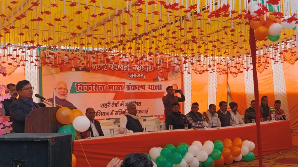आगरा। भारत सरकार द्वारा चलाई जा रही विकसित भारत संकल्प यात्रा की वैन मंगलवार को जगनेर पहुँची जहाँ नगर पंचायत जगनेर की ओर से भव्य कार्यक्रम आयोजित कर यात्रा का स्वागत किया गया। साथ ही कैंप लगाकर आम जनता को सरकारी योजनाओं की जानकारी देने के साथ पात्र व्यक्तियों का पंजीकरण भी कराया गया। प्रभारी अधिशासी अधिकारी अपर उपजिलाधिकारी सदर अनिल कुमार सिंह द्वारा अवगत कराया गया कि इस यात्रा का उद्देश्य सरकार की जन कल्याणकारी योजनाओं प्रधानमंत्री आवास योजना, पीएम स्वनिधि योजना, उज्ज्वला योजना,आयुष्मान कार्ड योजना आदि की जानकारी लोगों तक पहुंचाना और अवशेष पात्र व्यक्तियों को इन योजनाओं से लाभान्वित करना है। कैंप में लगभग 2000 व्यक्ति उपस्थित रहे। प्रधानमंत्री आवास योजना के लिए 406,आयुष्मान कार्ड के लिए 1382,आधार के लिए 1423 और उज्ज्वला योजना के लिए 1703 व्यक्तियों का पंजीकरण किया गया। कार्यक्रम में नगर पंचायत अध्यक्ष कुलदीप गर्ग व अन्य गणमान्य व्यक्ति तथा विभिन्न सरकारी विभागों के अधिकारी उपस्थित रहे।