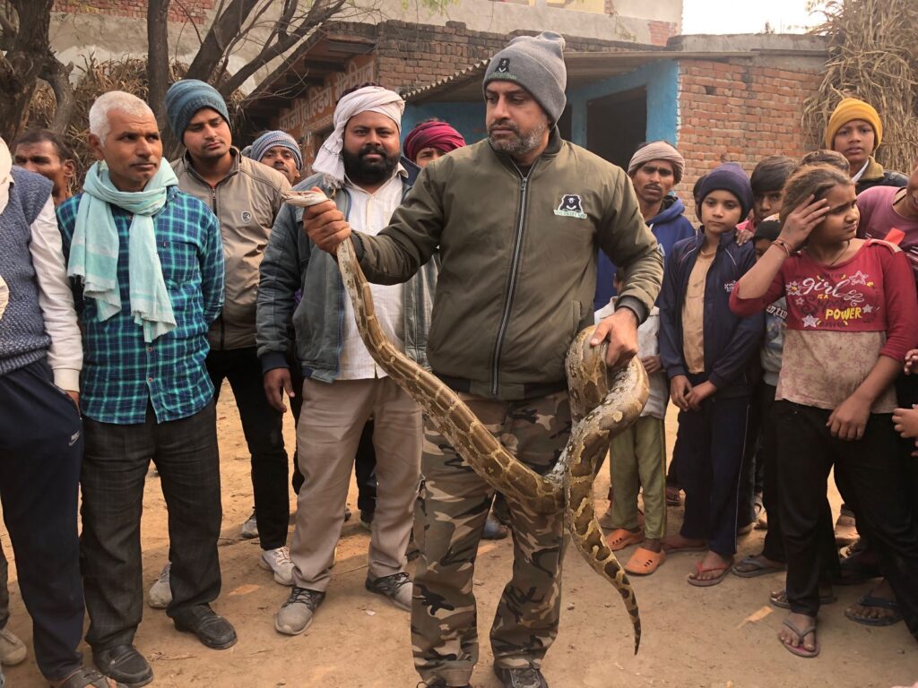 आगरा। ताजनगरी आगरा के अन्तर्गत दिगरौता निवासी मास्टर मेम्बर सिंह के खेत पर रविवार सुबह करीब 9 बजे खेत स्वामी जब पशुओं के लिए चारा लेने गए तो देखा करब के पूँज में बहुत बड़ा अजगर साँप देख डर गए। शोर शराबा सुन कर काफी लोगों की देखने भीड़भाड़ एकत्रित हो गई। खेत स्वामी ने तुरंत समाजसेवी पत्रकार इस्माइल को फोन पर सूचना दी,पत्रकार ने तत्काल साँप पकड़े वाली टीम का मोबाइल नम्बर दिया,सूचना पाकर टीम वहां पहुंची,टीम में होतम सिंह और श्रेष्ठ पचौरी पहुंचे जिन्होंने तुरंत साँप को पकड़ लिया, बोले इस साँप की सात फुट लम्बीई है यह साँप कीठम में छोड़ा जायेगा। वहां ग्रामीण मा० लोटन सिंह, रामवीर सिंह, विक्रम सिंह, रमेश,गुड्डू आदि मौजूद रहे।