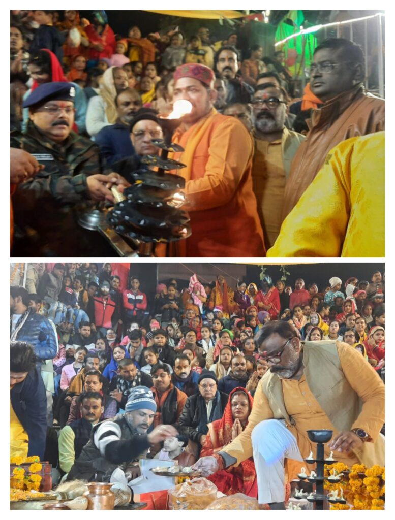 कार्यक्रम आयोजक संतोष गुप्ता ने सभी अतिथियों को अंगवस्त्र व माला पहनाकर सम्मानित किया। पुजारी राहुल शर्मा और संतोष आचार्य ने पूजन अर्चन कर कार्यक्रम का शुभारम्भ किया। सनातन ऋषि सत्संग महाआरती सेवा समिति चक्रतीर्थ नैमिषारण्य से आये आचार्यसचिन,नारायण,अक्षय,श्री मोहन,अमर ने वैदिक मंत्रोच्चारण के बीच पंचकोणीय आरती कर माहौल को भक्तिमय बना दिया।