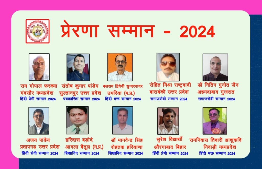 डॉ गुंडाल विजय कुमार, प्रदीप मिश्र अजनबी, डॉ हरेंद्र हर्ष, डॉ लाल सिंह किरार के सतत प्रयासों से प्रेरणा हिंदी प्रचारिणी सभा अपने हिंदी प्रचार का काम कर रही है और इन कार्यों के दौरान समाज के हर वर्ग से संवाद भी बनाए हुए हैं जिससे भविष्य में और बेहतर किया जा सके। दिनांक 10.01.2024 को जारी विज्ञप्ति में कवि संगम त्रिपाठी ने बताया कि इसी तारतम्य में वर्ष 2024 के प्रथम माह में सर्वप्रथम हिंदी सेवी सम्मान 2024 अजय पांडेय पत्रकार प्रतापगढ़ उत्तर प्रदेश। हिंदी प्रेमी सम्मान 2024 राम गोपाल फरक्या मंदसौर व सुरेश विद्यार्थी औरंगाबाद बिहार। हिंदी भक्त सम्मान 2024 बलराम द्विवेदी सुन्दरदादर उमरिया व रामनिवास तिवारी आशुकवि निवाड़ी मध्यप्रदेश। पत्रकारिता सम्मान 2024 संतोष कुमार पांडेय सुल्तानपुर उत्तर प्रदेश। समाजसेवी सम्मान 2024 रोहित मिश्रा राष्ट्रवादी संपादक रोहित संवाद बाराबंकी उत्तर प्रदेश व डॉ नितिन मनोत अहमदाबाद गुजरात को दिया गया।