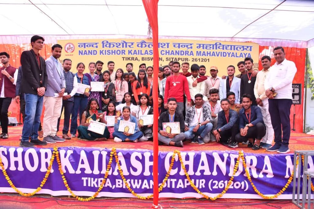 बिसवां क्षेत्र के अंतर्गत नंद किशोर कैलाश चंद्र महाविद्यालय सिधौली रोड टिकरा में युवा महोत्सव/प्रतिभा सम्मान समारोह हुआ सफलता पूर्वक सम्पन्न। जिसमें कार्यक्रम के अध्यक्ष मा. निर्मल वर्मा जी विधायक बिसवां तथा मुख्य अतिथि के रूप में मा.राजेश वर्मा नि.सांसद सीतापुर तथा विशिष्ट अतीत के रूप में माननीय सुनील वर्मा नि. विधायक लहरपुर उपस्थित रहे। कार्यक्रम के अतिथियों ने अपने विचार व्यक्त करते हुए युवाओं को कड़ी मेहनत और समर्पण के साथ आगे बढ़ने के लिए प्रेरित किया। समारोह में विभिन्न शैक्षणिक, सांस्कृतिक, खेलकूद और अन्य क्षेत्रों में उत्कृष्ट प्रदर्शन करने वाले विद्यार्थियों को सम्मानित किया गया। जिसमें शगुफ्ता सिद्दीकी,कामिनी वर्मा,सिमरन वाल्मीकि, दिव्यांशु वर्मा आदि विद्यार्थी गण और अन्य भी कई श्रेष्ठ प्रदर्शन करने वाले विद्यार्थियों को सम्मानित किया गया तथा विभिन्न श्रेणियों में श्रेष्ठ प्रदर्शन करने वाले प्रतिभागियों को ट्रॉफी, प्रमाण पत्र और मेडल प्रदान किए गए।
