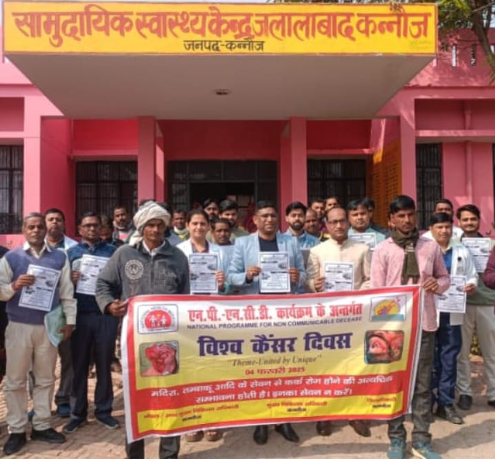 कन्नौज।जलालाबाद ब्लॉक के सीएचसी जलालाबाद में चिकित्साधीक्षक डॉ.मनोज कुमार के नेतृत्व में में विश्व कैंसर दिवस मनाया। इसमें लोगों को कैंसर जैसी घातक बीमारी के लक्षणों एवं बचाव के बारे में बताया गया। सीएचसी अधीक्षक ने बताया कैंसर बीमारी इस समय जो लोग अत्यधिक धूम्रपान का सेवन कर रहे और प्लास्टिक की थैली में गरम खाना या अन्य वस्तुएं और प्लास्टिक के टिफिन में गरम खाना को रखना आदि की वजह से कैंसर अत्यधिक हो रहा है। इस मौके पर डॉ.मनोज कुमार,डॉ.शिवांगी,डॉ.अमीर जमाल,सीपी पांडे,राजेश,पंकज गुप्ता,मयंक मिश्रा,शैलेन्द्र, निर्मेश कुमार,सुशील कुमार आदि लोग उपस्थित रहे।