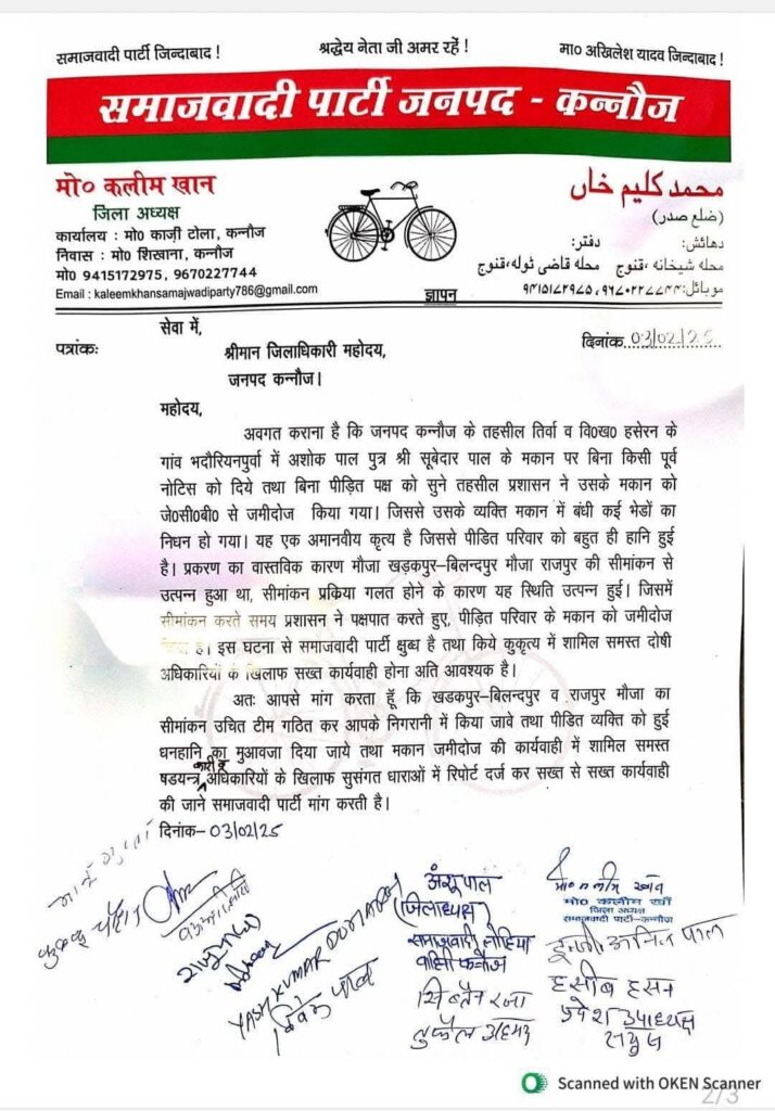 कन्नौज: समाजवादी पार्टी के पदाधिकारी ने ग्राम भदोरियन पुरवा मैं बिना नोटिस के मकान पर जेसीबी चलाने का जमकर विरोध किया| और उन्होंने जिलाधिकारी को शिकायती पत्र सोपा जिसमें उन्होंने बताया कि बिना किसी नोटिस किसी की गृहस्ती उजाड़ देना यह कानून के खिलाफ है | भदौरिन पुरवा निवासी अशोक पाल का मकान जिसमें वह लगभग 35 वर्ष से अपने परिवार सहित निवास कर रहा था जिसको तिर्वा के अधिकारियों द्वारा बिना किसी नोटिस के गिरवा दिया गया और पीड़ित पक्ष की कोई भी बात नहीं सुनी गई| यह सरासर तानाशाही की बात है और वास्तविक करण मौजा खड़कपुर – बिलंदपुर मौजा राजपुर सीमांकन से उत्पन्न हुआ था सीमांकन प्रक्रिया गलत हुई थी यही कारण यह स्थिति उत्पन्न हुई जिसमें सीमांकन करते समय अधिकारियों ने पक्षपात किया जिसमें पीड़ित का मकान जमीदो ज किया गया किया गया इस घटना से समाजवादी पार्टी के लोग नाराज हैं कहना है| इसमें शामिल अधिकारियों की जांच की जाए और जो भी दोषी पाया जाए उसके ऊपर तत्काल कार्रवाई की जाए और जो पीड़ित परिवार की संपत्ति का नुकसान हुआ है| पीड़ित परिवार को मुआवजा दिया जाए इस मौके पर समाजवादी पार्टी के जिला अध्यक्ष कलीम खान अनिल पाल इंजीनियर अंशु पाल समाजवादी पार्टी लोहिया वाहिनी हसीब हसन प्रदेश अध्यक्ष भानु गुप्ता विवेक पाल आदि पदाधिकारी मौजूद रहे
