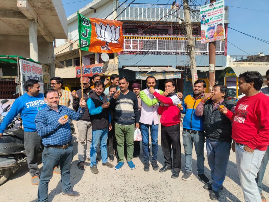 आज दिल्ली विधानसभा चुनाव और मिल्कीपुर विधानसभा उपचुनाव में भारतीय जनता पार्टी को मिली ऐतिहासिक जीत पर मोहल्ला इंद्रानगर स्थित सभासद हिमांक त्रिपाठी के आवास पर भाजपा कार्यकर्ताओं ने मिठाई बांटकर जीत का जश्न मनाया इस अवसर पर सभासद हिमांक त्रिपाठी ने कहा दिल्ली विधानसभा चुनाव में मिली ऐतिहासिक जीत प्रधानमंत्री नरेन्द्र मोदी जी द्वारा कराये जा रहे विकास के कार्यों पर जनता की मोहर है दिल्ली की जनता ने भ्रष्टाचार में डूबी केजरीवाल की सरकार को हटाकर विकास करने बाली को सरकार को चुना है
