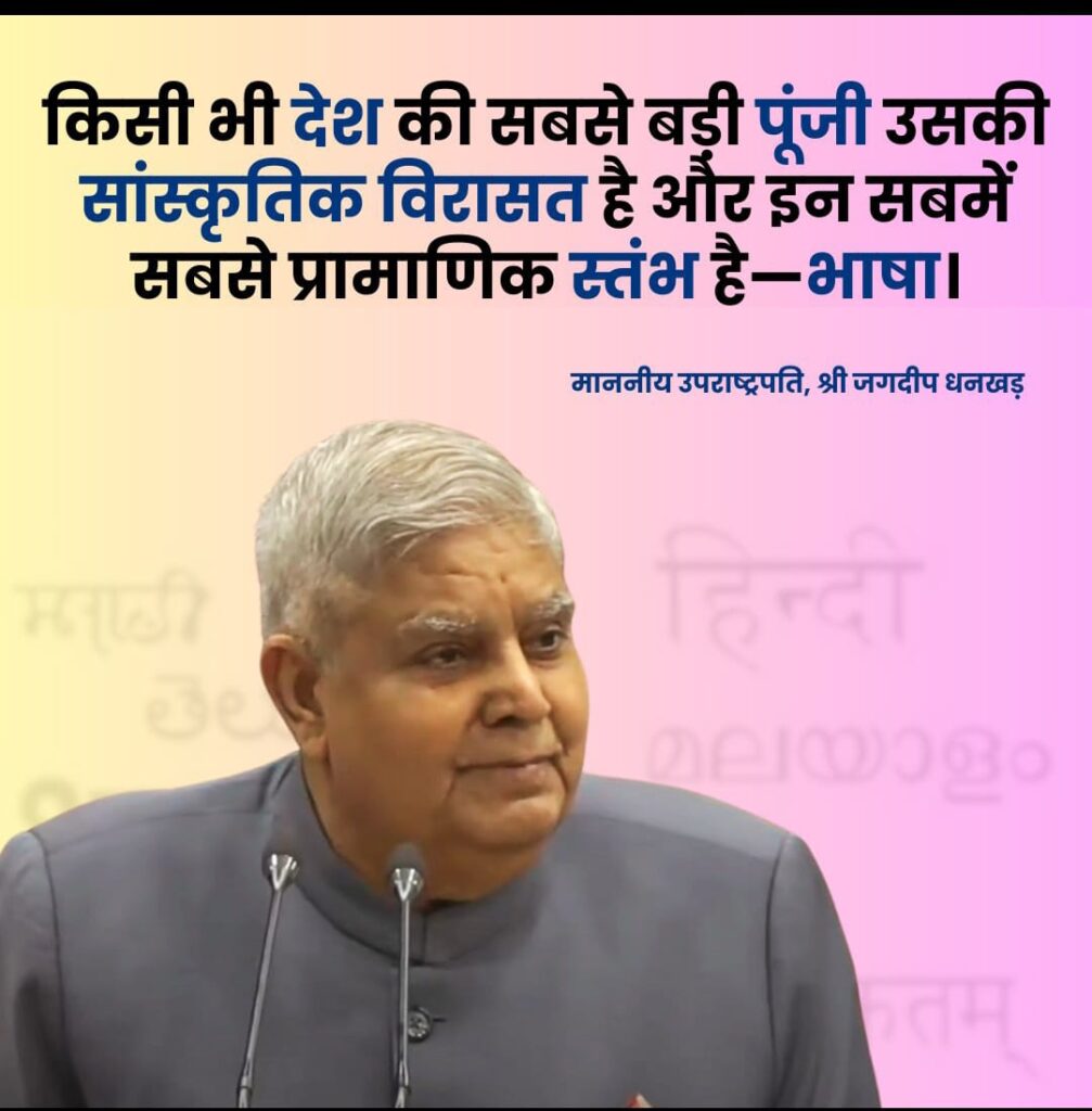 नई दिल्ली- देश के उप-राष्ट्रपति जगदीप धनखड़ ने आज गुरुवार को 98वें अखिल भारतीय मराठी साहित्य सम्मेलन प्रतिनिधिमण्डल को संबोधित किया। अपने सम्बोधन में उन्होंने कहा कि किसी भी देश की सबसे बड़ी पूंजी उसकी सांस्कृतिक विरासत है, इन सबमें भाषा सबसे प्रामाणिक स्तंभ है। करीब 1200-1300 वर्ष पहले जब सब कुछ उत्थान पर था, सब ठीक चल रहा था। दुनिया हमारी ओर देख रही थी, हम ज्ञान के भंडार थे। नालंदा, तक्षशिला जैसी संस्थाएं हमारे हाथ थीं, फिर आक्रमणकारी आए, वे हमारी भाषा, संस्कृति, और धार्मिक स्थानों के लिए बहुत दमनकारी एवं क्रूर थे।