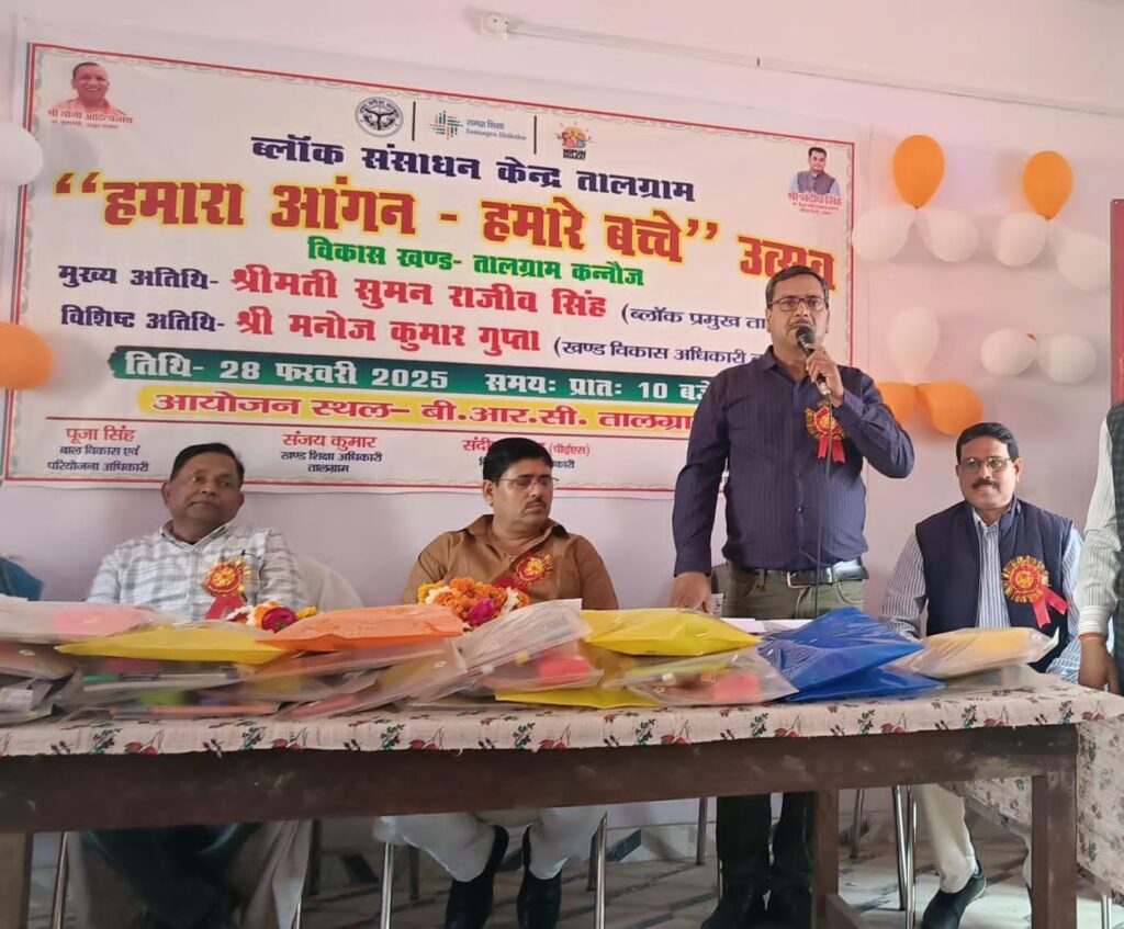 कन्नौज।ब्लॉक संसाधन केंद्र सराय प्रयाग में हमारा आंगन हमारे बच्चे उत्सव का आयोजन ब्लॉक प्रमुख सुमन राजीव सिंह की अध्यक्षता एवं खंड विकास अधिकारी की विशिष्ट उपस्थिति में किया गया।उक्त कार्यशाला में मुख्य अतिथि सुमन राजीव सिंह द्वारा दीप प्रज्वलन करते हुए कार्यक्रम का शुभारंभ किया गया और अपने संबोधन में बताया की शासन स्तर पर विद्यालयों एवं आंगनबाड़ी केंद्रों में कई योजनाएं संचालित की जाती हैं। आप सभी आंगनबाड़ी कार्यकत्रियों एवं अध्यापकों का दायित्व है कि इन योजनाओं का सफल संचालन करते हुए ब्लॉक को निपुण ब्लॉक घोषित करने में अपना अपेक्षित सहयोग प्रदान करें साथ ही ब्लॉक प्रमुख द्वारा ब्लॉक संसाधन केंद्र परिसर में अध्यापकों की सहूलियत केलिए वाटर कूलर लगवाने की घोषणा की जिसका उपस्थित सभी अध्यापकों द्वारा स्वागत किया। कार्यक्रम के संचालक ARP अरविंद चौहान द्वारा निपुण भारत मिशन एवं राष्ट्रीय शिक्षा नीति 2020 के परिपेक्ष में पूर्व प्राथमिक शिक्षा एवं बुनियादी शिक्षा के उद्देश्यों का प्रस्तुतीकरण किया साथ ही स्कूल रीडीनेस और पूर्व प्राथमिक शिक्षा हेतु वर्ष 2024 25 में किए गए कार्यक्रमों का के बारे में विस्तृत जानकारी साझा की। खंड शिक्षा अधिकारी संजय कुमार द्वारा आदर्श बाल वाटिका प्री प्राइमरी शिक्षा में राज्य के प्रयास पर चर्चा की गई,ARP डॉ पंकज यादव द्वारा माता उन्मुखीकरण पर चर्चा की गई,ARP मलखान सिंह द्वारा स्टेशनरी एवं चार लर्निंग कॉर्नर पर चर्चा की गई, ARP सुदीप पटेल सभी आगंतुक अतिथियों का स्वागत एवं धन्यवाद ज्ञापित किया गया, ARP रेवती रमन सिंह द्वारा को लोकेटेड आंगनबाड़ी केंद्र और विद्यालयों के स्टाफ के साथ बेहतर समन्वय पर चर्चा की गई। कार्यक्रम के अंत में माननीय ब्लॉक प्रमुख तालग्राम,खंड विकास अधिकारी तालग्राम एवं खंड शिक्षा अधिकारी द्वारा प्रत्येक न्याय पंचायत से पांच निपुण बच्चों और उनके अभिभावकों को सम्मानित किया गया। जिसमें से तीन बच्चे बाल वाटिका से और दो बच्चे कक्षा एक एवं दो से थे इस प्रकार कल 60 बच्चों को पुरस्कृत कर प्रमाण पत्र देकर सम्मानित किया गया। उक्त कार्यक्रम में मीनू सिंह,नवीन मिश्रा,संजीव राजपूत,सुमित यादव,विक्रम शाक्य,अंजली सिंह, शिवम गुप्ता, उज्जवल सिंह, राम वर्मा, अतुल सक्सेना, ऋषभ सक्सेना, अमरदीप, शिवम कुमार दीपक कुमार सहित आदि लोग उपस्थित रहे।