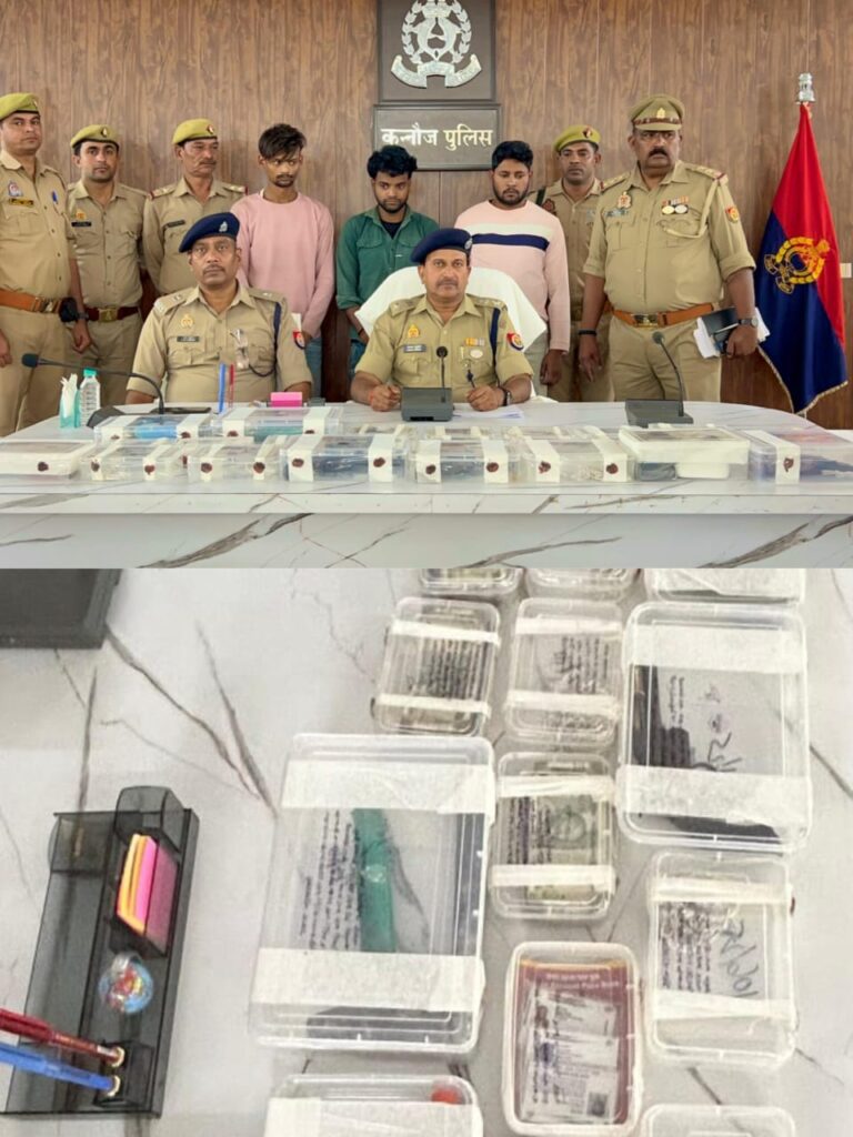 पिछले कुछ समय से कन्नौज के छिबरामऊ में पुलिस के लिए सर दर्द बन चोरी की गैंग के चार सदर चोरों को छिबरामऊ पुलिस ने गिरफ्तार कर लिया चोरों के पास से सोने व चांदी के आभूषण बरामद किए आभूषण की कीमत 10 लाख रुपए शाहिद ₹80000 नगद बरामद हुए घटना का खुलासा करते हुए पुलिस अधीक्षक विनोद कुमार सिंह ने बताया की छिबरामऊ कोतवाली क्षेत्र के द्वारा यह बहुत सराहनीय कार्य किया गया है आज चोरी की कई घटनाओं का खुलासा किया गया जिसमें 37 चोरों और एक बाल औपचारिक को गिरफ्तार कर और उनके कब्जे से लाखों रुपए के जेवर सहित नगदी बरामद हुई इसमें एक चोर नाबालिक है लेकिन गैंग का असली मास्टरमाइंड वही है सभी चोरों को अग्रिम कार्रवाई करके न्याय विरासत में भेजा जा रहा है वही मेरी तरफ से कोतवाली प्रभारी अजय स्वास्थ्य सहित उनकी पूरी टीम के सराहनीय के कार्य के लिए ₹20000 का नाम पुरस्कार किया जाएगा