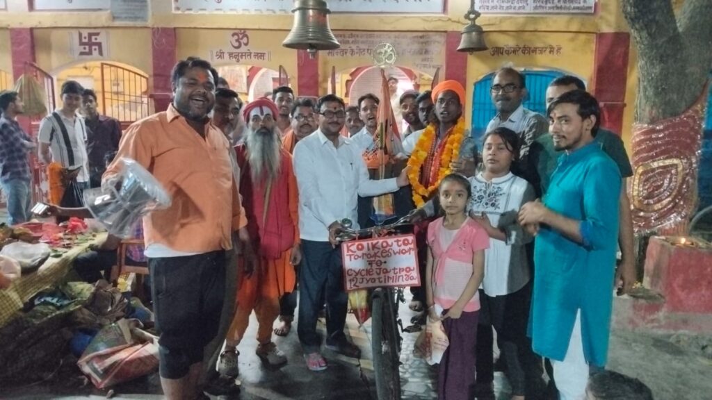 कोलकाता से साइकिल से चारों धाम की यात्रा पूर्ण कर भक्त सोमनाथ पहुंचे हनुमान मंदिर चिलबिला पर भक्तों ने किया भव्य स्वागत