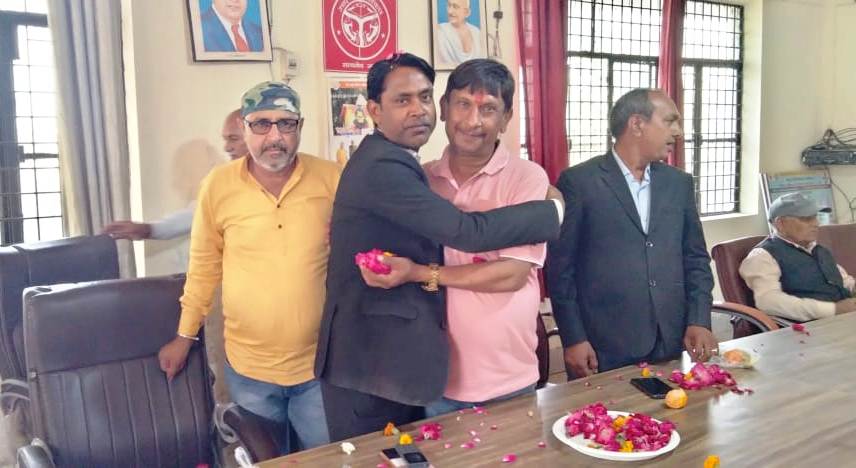 कार्यक्रम में एक दूसरे को गले लगाते अधिवक्ता