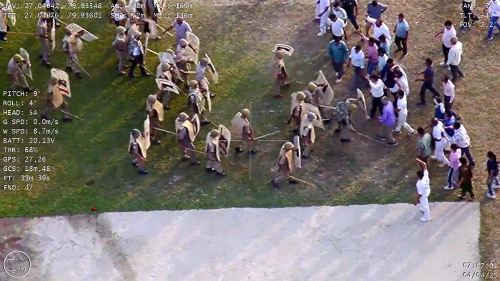 बलवा ड्रिल के डेमोंसट्रेशन की सम्पूर्ण कार्यवाही के दौरान ड्रोन कैमरे से लगातार निगरानी भी की गयी।