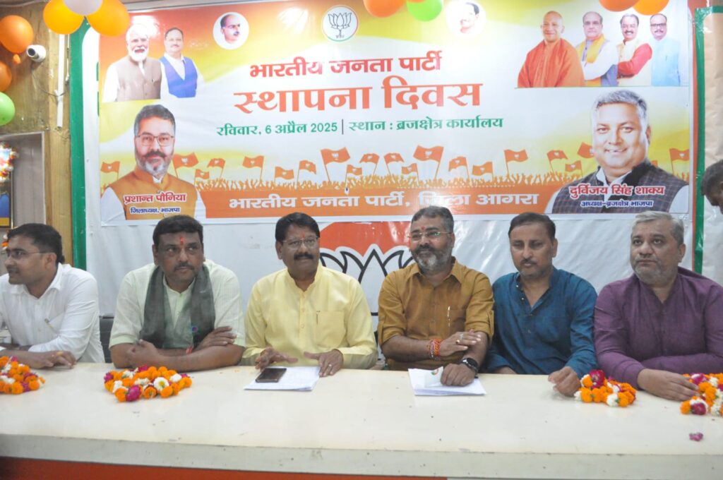 आगरा। रविवार को ब्रज क्षेत्र कार्यालय जयपुर हाउस आगरा में प्रेस को संबोधित करते हुए भाजपा के महानगर अध्यक्ष राजकुमार गुप्ता ने कहा कि भारतीय जनता पार्टी अपना 45 वा स्थापना दिवस पूरे प्रदेश में धूम धाम से मनाएगी।6 अप्रैल से 13 अप्रैल तक हर जिले में विभिन्न कार्यक्रम आयोजित होंगे।6 अप्रैल को हर जिले के मुख्यालय पर भव्य सजावट की गई है।7 अप्रैल को प्रत्येक बूथ पर श्रद्धेय श्यामा प्रसाद मुखर्जी जी,पंडित दीन दयाल उपाध्याय जी एवं भारत माता के चित्रों पर पुष्पांजलि अर्पित की जाएगी।8 और 9 अप्रैल को हर विधानसभा में सक्रिय सदस्य सम्मेलन आयोजित होंगे।