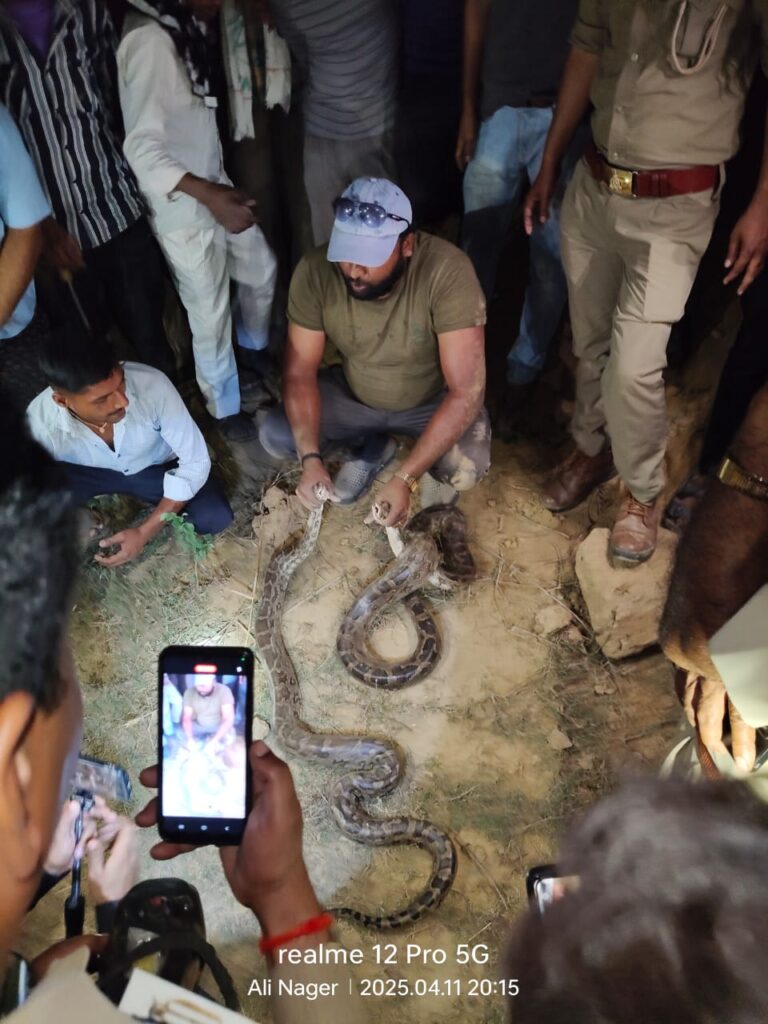 कन्नौज। रात के अंधेरे में ग्रामीणों ने जमीन पर रेंगते हुए देखा तो टोर्च से रोशनी की। देखते ही ग्रामीणों के होश उड़ गए। अजगर सर्प देखे जाने से हड़कंप मच गया। आसपास के लोग एकत्रित हो गए। गांव के लोगों की भीड़ लग गई। सूचना पर पहुंची वन विभाग की टीम निवेश क्यों कर एक नहीं बल्कि तीन अजगर पकड़े। पकड़े जाने पर लोगों ने राहत की सांस ली। कन्नौज जिले के पचोर चौकी क्षेत्र के अंतर्गत कपूर पुरवा गांव में देर रात अंधेरे में अजगर देखे जाने से हड़कंप मच गया। गांव के लोगों ने इसकी सूचना वन विभाग की टीम को दी। सूचना पर पहुंची वन विभाग की टीम ने रेस्क्यू कर अजगर सर्प पकड़ा। वही आसपास अजगर और देखे जाने से हड़कंप मच गया। टीम नरेश क्यों कर एक दो नहीं बल्कि तीन अजगर सर्प पकड़े। पकड़े जाने के बाद गांव के लोगों ने राहत की सांस ली।