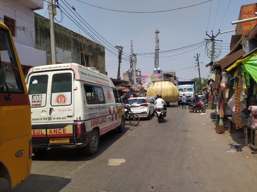 ओवरलोड ट्रैक्टर की वजह से बाजार में लगा लंबा जाम, जाम में फांसी एम्बुलेंस