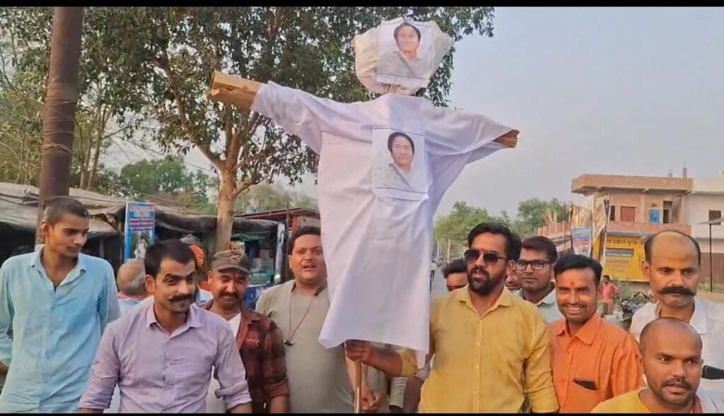 बंगाल में हिंदुओं पर अत्याचार के विरोध में ठठिया में युवाओं ने फूंका ममता बनर्जी का पुतला।