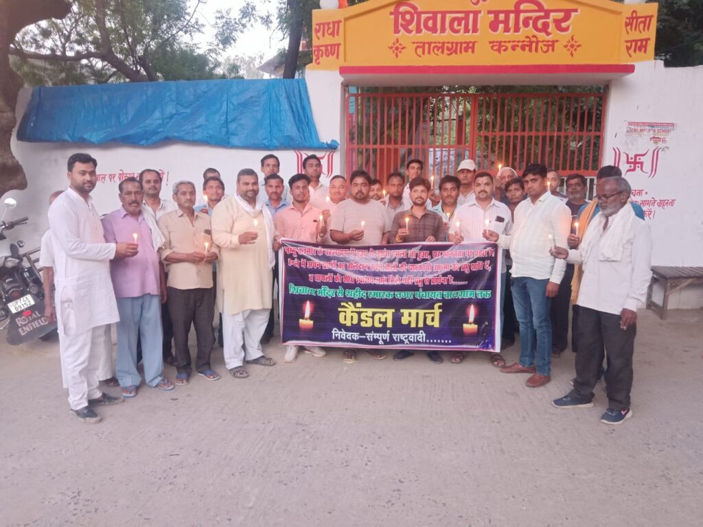 तालग्राम कन्नौज; जम्मू कश्मीर के पहलगाम मैं आतंकियों द्वारा निर्दोष व्यक्तियों की हत्या के विरोध में आज पूरे भारत में विरोध प्रदर्शन जारी है जनपद कन्नौज के ब्लाक तालग्राम में शिवाला मंदिर पर काफी संख्या में सनातनियों ने एकत्रित होकर कैंडल मार्च निकालकर विरोध प्रदर्शन किया शिवाला मंदिर से शुरू होकर में मार्केट से हिंदुस्तान जिंदाबाद पाकिस्तान मुर्दाबाद के नारे लगाए और भारत माता की जय कहते हुए मैंनमार्केट होते हुए सब्जी मंडी नगर पंचायत के पास में बने हुए शहीद स्मारक पर पहुंचकर 2 मिनट का मौन रखकर उनकी आत्मा की शांति के लिए भगवान से प्रार्थना की और सनातन धर्म के लोगों ने जमकर विरोध प्रदर्शन किया कि हम भारतवासी हैं और उन्होंने कहा कि हमारी भारतीय सेना पाकिस्तान को मुंहतोड़ जवाब देगीइस मौके पर संजय पटेल भाजपा मंडल उपाध्यक्ष राम अवतार राजेश शर्मा सभासद अतुल कुमार गुप्ता उर्फ लला सौरभ गुप्ता पंकज ठाकुर सभासद रजनीश जोशी रजनीश राजपूत अनिल मिश्रा कोटेदार अनिल कुमार डॉक्टर बृजभूषण यादव राजा चौरसिया अंकित जोशी पंडित अवनीश जोशी मांगू लाल बाथम कई सैकड़ा लोग लोग उपस्थित रहे वहीं थाना अध्यक्ष की गाड़ी मौके पर मैं पुलिस बल के साथ मौजूद रही