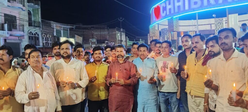 छिबरामऊ कन्नौज; जम्मू कश्मीर के पहलगाम मैं आतंकियों द्वारा निर्दोष व्यक्तियों की हत्या के विरोध में आज पूरे भारत में विरोध प्रदर्शन जारी है जनपद कन्नौज के छिबरामऊ में पीपल चौराहा मंदिर पर काफी संख्या में सनातनियों ने एकत्रित होकर कैंडल मार्च निकालकर विरोध प्रदर्शन किया पीपर चौराहा मंदिर से शुरू होकर मेंन मार्केट से हिंदुस्तान जिंदाबाद पाकिस्तान मुर्दाबाद के नारे लगाए और भारत माता की जय कहते हुए मैंन मार्केट होते हुए के तिरंगा तिराहा पर पहुंचकर समापन हुआ 2 मिनट का मौन रखकर उनकी आत्मा की शांति के लिए भगवान से प्रार्थना की और सनातन धर्म के लोगों ने जमकर विरोध प्रदर्शन किया कि हम भारतवासी हैं और उन्होंने कहा कि हमारी भारतीय सेना पाकिस्तान को मुंहतोड़ जवाब देगी इस मौके पर विधायक अर्चना पांडे अध्यक्ष मनोज दुबे,सक्षम गुप्ता नगर मंत्री भाजयुमो