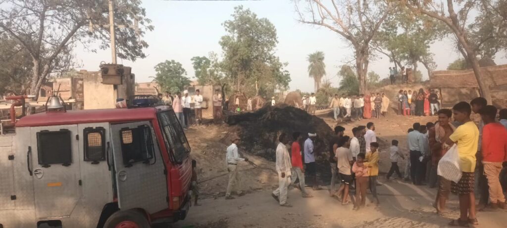 गुगरापुर, कन्नौज।शनिवार को विकास खंड गुगरापुर की ग्राम पंचायत चांदापुर के मजरा निवादा मे अज्ञात कारणों के चलते आग लग गयी।आग मे लगभग बारह लोगों का अनाज,भूसा, मशीनरी, सहित आंशिक रूप से कुछ जानवर और भेंड के बच्चों के जल कर मरने की बात भी बताई गयी।फायर ब्रिगेड के पहुंचने तक लाखों रुपए का सामान स्वाहा हो गया।वरिष्ठ अधिकारियों ने मौके पर पहुँच कर हुई क्षति का आंकलन किया। विकास खंड गुगरापुर की ग्रामपंचायत चांदापुर के मजरा निवादा मे शनिवार को गाँव के बाहर बने पुत्तीलाल के फूस के बंगले मे अज्ञात कारणों से दोपहर बाद लगभग पौने तीन बजे अचानक आग लग गयी। गांव बाले जब तक कुछ समझ पाते तब तक आग ने भयंकर रूप ले लिया। ग्रामीणों द्वारा आग बुझाने का प्रयास चलता रहा। सूचना पाकर फायर ब्रिगेड दल ने दो गाड़ियों सहित मौके पर पहुँच कर आग पर नियंत्रण पाया। इस बीच गेँहू, भूसा, ट्रैक्टर, आंशिक रूप से गाय, पड़िया (भैस का बच्चा) जल गया। पशु पालक के अनुसार भेंड़ के छोटे बच्चे भी जल गए। पीड़ितों के अनुसार शिवकेश का एक आयशर ट्रैक्टर,भैस की पड़िया, लगभग 15 कुंतल गेँहू और लगभग 15 कुंतल भूसा, सहदेव का लगभग 12 कुंतल गेंहू और लगभग 12 कुंतल भूसा, तेज सिंह की एक गाय आशिंक रूप से जल गयी, लगभग 10 कुंतल गेँहू और लगभग 10 कुंतल भूसा, रामकुमार का लगभग 15 कुंतल गेँहू और लगभग 15 कुंतल भूसा, नरवीर की एक गाय और एक पड़िया आंशिक रूप से जल गयी। इसी प्रकार नरबीर , रामबीर, रामविलास, सुरेश, विमलेश का भी गेंहूं और भूसा जल गया। पुत्ती सिंह की गाय भी आंशिक रूप जल गयी वहीं मनफूल के दो उपलों के ढेर (बठेहा) जल गए। राजू पुत्र सुरेश और विमलेश पुत्र विश्राम के अनुसार दोनों के चार पांच दिन पहले जन्मे भेड़ों के लगभग बारह बारह बच्चे जल कर राख होने की बात कही गयी किंतु बच्चों के कंकाल न मिलने से अधिकारियों ने तबज्जो नही दिया।घटना स्थल पर पहुँच कर एस डी एम नवनीत राय,तहसील दार अभिनव,नायब तहसीलदार राकेश कुशवाहा,कानून गो रक्षपाल, मदन मोहन,लेखपाल निखिल कुमार, प्रधान प्रतिनिधि राजेंद्र सिंह यादव ने अग्निकांड से हुई क्षति का आंकलन करने की कोशिश की।चौकी कुसुमखोर पुलिस टीम भी घटना स्थल पर डटी रही।