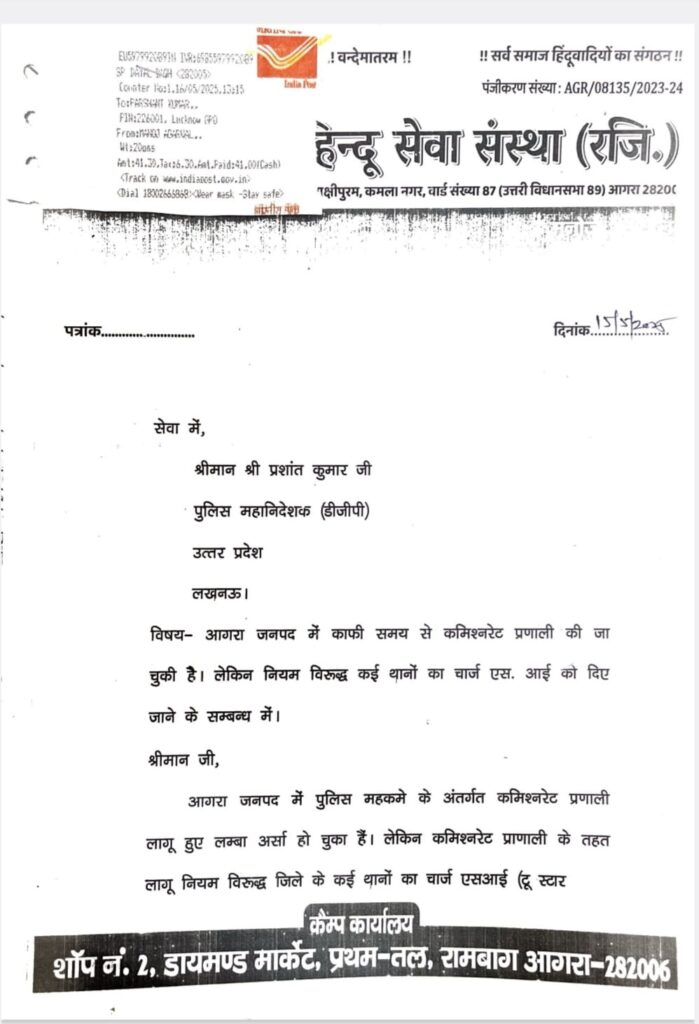 आगरा। आगरा जनपद में काफी समय से कमिश्नरेट प्रणाली लागू हो चुकी है लेकिन नियम विरुद्ध कई थानों का चार्ज एस.आई. को दिए जा रहे हैं। भारतीय हिंदू संस्था के प्रदेश अध्यक्ष मनोज अग्रवाल ने इस मामले में एक शिकायती पत्र उत्तर प्रदेश के पुलिस महानिदेशक (डीजीपी) को भेजा है। पत्र में लिखा गया है कि आगरा जनपद में पुलिस महकमे के अंतर्गत कमिश्नरेट प्रणाली लागू हुए लंबा अर्सा हो चुका है, लेकिन कमिश्नरेट प्रणाली के तहत लागू नियम विरुद्ध जिले के कई थानों का चार्ज एस.आई. (टू स्टार दरोगा) को सौंप दिया गया है। अधिकृत रूप से प्राप्त जानकारी के अनुसार जिस जनपद में कमिश्नरेट प्रणाली लागू हो जाती है। वहां नियमानुसार शहरी एवं देहात सभी थानों का चार्ज इंस्पेक्टर (प्रभारी निरीक्षक थ्री स्टार) को सौंपा जाना चाहिए, लेकिन आगरा जनपद में नियम विरुद्ध कई थानों का चार्ज एस.आई. को मनमाने एवं नियम विरुद्ध तरीके से उच्चाधिकारी सौंप रहे हैं जो पुलिस नियमावली का सरासर उल्लंघन है।