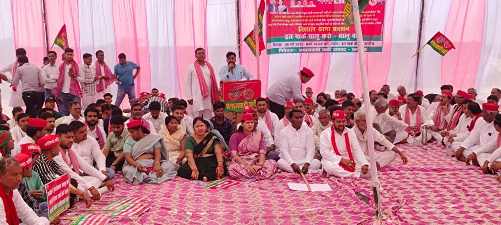 उत्तर प्रदेश कन्नौज , समाजवादी कार्यकर्ताओं ने पूर्व मुख्यमंत्री अखिलेश द्वारा बनाई गई इत्र पार्क को चालू करने के लिए किया धरना प्रदर्शन।