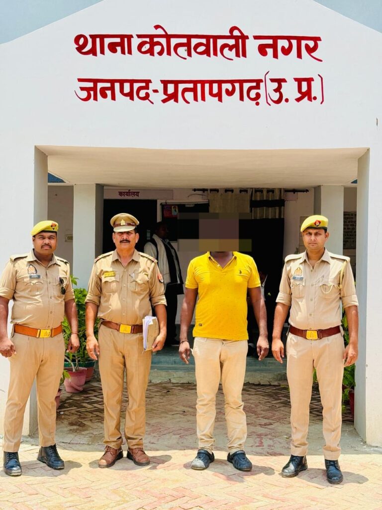 पुलिस अधीक्षक प्रतापगढ़ डाॅ0 अनिल कुमार द्वारा अपराधिक क्रियाकलाप में संलिप्त अपराधियों के विरुद्ध चलाए जा रहे अभियान के क्रम में अपर पुलिस अधीक्षक (पूर्वी) श्री शैलेन्द्र लाल के मार्ग दर्शन व क्षेत्राधिकारी नगर श्री शिव नारायण वैस द्वारा अपराध एवं अपराधियों की रोकथाम/ अंकुश लगाने हेतु दिये गये निर्देश के क्रम में थाना प्रभारी कोतवाली नगर श्री जयचन्द भारती के नेतृत्व में उ0नि0 लक्ष्मीकान्त शर्मा मय हमराह* कां० मलखान व कां० विमल द्वारा तलाश वांछित, वारण्टी अभियुक्त व विवेचनात्मक कार्यवाही के दौरान थाना कोतवाली नगर में पंजीकृत मु0अ0सं0 636/24 धारा 303(2), 317 (2) बीएनएस से संबंधित प्रकाश में आये अभियुक्त रवि कुमार गुप्ता उर्फ दीपक पुत्र मालिक राम गुप्ता निवासी जंगल टिकरी थाना गौरीगंज जनपद अमेठी को लोकेशन के आधार पर संजय कुमार चौहान के गैरेज के सामने मुंशी बाजार थाना जनपद अमेठी से ई रिक्शा से बैटरियों को चोरी करने की घटना में प्रयुक्त 01 कार इनोवा रंग सफेद व रु0-500/- के साथ गिरफ्तार किया गया