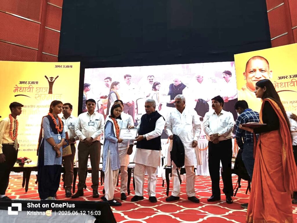 माननीय मुख्यमंत्री योगी आदित्यनाथ जी द्वारा लखनऊ में आयोजित मेधावी सम्मान समारोह में सरदार सिंह कान्वेन्ट इंटर कॉलेज की छात्राओं आंचल वर्मा को हाई स्कूल बोर्ड परीक्षा 2025 में प्रदेश की टॉप 10 सूची में चौथा स्थान एवं सिद्धी सिंह को सातवां स्थान लाने के लिए दोनों छात्रों को एक एक लाख रुपए, टैबलेट और प्रशस्ति पत्र देकर सम्मानित किया इस अवसर पर माननीय मंत्री राकेश सचान जी, मयंकेश्वर शरण सिंह जी, संजय सिंह गंगवार जी, सहित माननीय एम एल सी उमेश द्विवेदी जी एवं शिक्षक विधायक अवनीश सिंह जी मौजूद रहे। उत्तर प्रदेश के मुख्यमंत्री योगी आदित्यनाथ जी ने राजधानी लखनऊ में आयोजित एक भव्य समारोह में प्रदेश के विभिन्न जिलों से आए मेधावी छात्र-छात्राओं को सम्मानित किया। यह सम्मान समारोह उन विद्यार्थियों के लिए आयोजित किया गया जिन्होंने बोर्ड परीक्षाओं में उत्कृष्ट प्रदर्शन कर राज्य का नाम रोशन किया।मुख्यमंत्री योगी आदित्यनाथ जी ने अपने संबोधन में कहा कि यह छात्र हमारे प्रदेश का उज्ज्वल भविष्य हैं और राज्य सरकार सदैव प्रतिभाओं को प्रोत्साहित करने के लिए तत्पर है।
