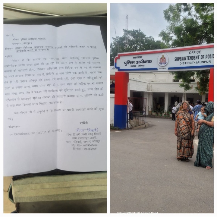 घर के इकलौते चिराग सोनू तिवारी की बदमाशों ने किया हत्या फोन पर संपर्क करके बुलाया गया था पत्नी दीपा तिवारी का रो रो कर बुरा हाल हो रहा है कोतवाली मरियाहू मैं अपराध संख्या 195 /25 पर मुकदमा दर्ज हुआ अभियुक्त जेल में इसके बावजूद अभियुक्त के परिवार व रिश्तेदारों द्वारा दीपा तिवारी व उनके परिवार को जान से मारने के धमकी लगातार मिल रही है विवेचना अधिकारी सभी सुसंगत धाराओं को दर्ज करने से कतरा रहा है समय रहते जौनपुर प्रशासन प्रकरण पर प्रभावी कार्यवाही नहीं किया तो किसी बड़े अनहोनी की आशंका को नकारा नहीं जा सकता प्रार्थनीय दीपा तिवारी ने पुलिस अधीक्षक जौनपुर प्रार्थना पत्र देकर अपने व परिजनों के सुरक्षा के साथ हत्यारों पर कड़ी कार्रवाई करने की मांग किया है अपर पुलिस अधीक्षक ग्रामीण जौनपुर ने कानून का कडाई से अनुपालन कराने का आश्वासन दिया