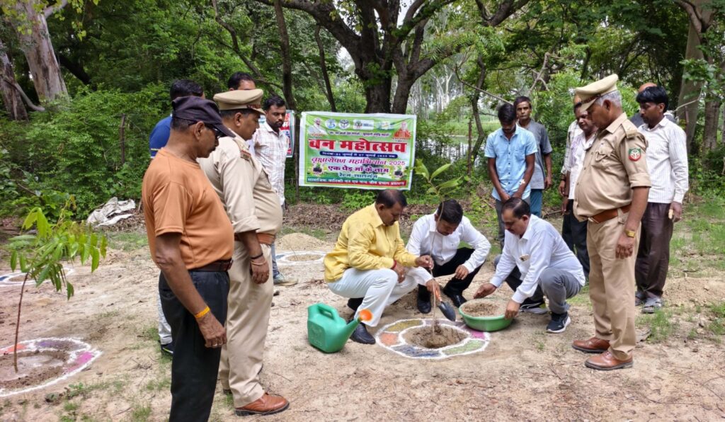 लालगंज शीतलमऊ वन प्रभाग में पौध रोपित करते वन क्षेत्राधिकारी एवं अतिथि