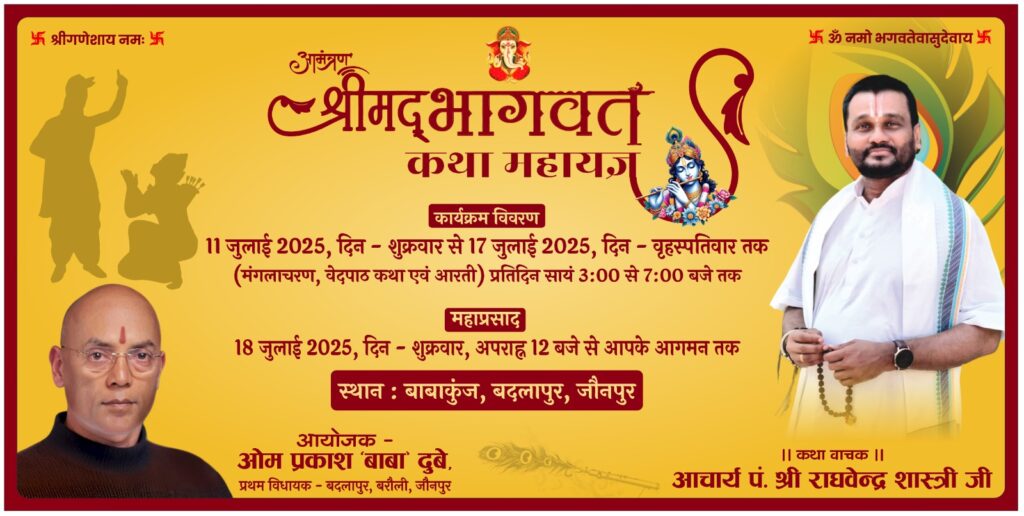 पूर्व विधायक ओम प्रकाश बाबा दुबे ने बताया कि श्रीमद् भागवत पुराण को भगवान कृष्ण का साहित्यिक अवतार माना जाता है. श्रीमद् भागवत कथा सुनने से आध्यात्मिक विकास और भगवान के प्रति भक्ति गहरी होती है. श्रीमद् भागवत कथा स्वयं की प्रकृति और परम वास्तविकता के बारे में सिखाती है.समस्त क्षेत्र वासियों से आग्रह है कि ज्यादा से ज्यादा संख्या में लोग बाबा कुंज में पहुंच कर 11जुलाई से 17 जुलाई तक सायं तीन बजे से सात बजे तक कथा का रस पान करे 18 जुलाई को यहां महाप्रसाद अवश्य ग्रहण करें निवेदक प्रथम विधायक ओम प्रकाश बाबा दुबे जी स्थान बाबा कुन्ज बरौली बदलापुर