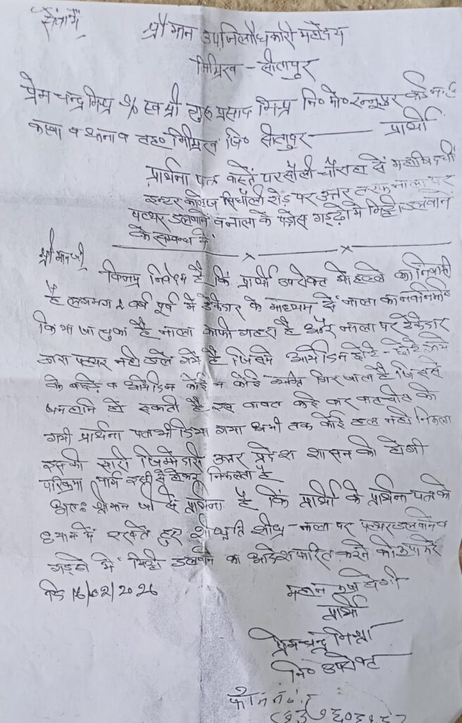 मिश्रित सीतापुर / कस्बा मिश्रित के मोहल्ला रन्नुपुर वार्ड नंबर 3 निवासी प्रेमचंद्र मिश्र पुत्र गुरु प्रसाद मिश्र ने उपजिलाधिकारी मिश्रित को एक शिकायती पत्र देकर आरोप लगाया है । कि मोहल्ला रन्नूपुर में लग भग 1 वर्ष पहले ठेकेदार द्वारा नाले का नव निर्माण कराया गया था । जो काफी गहरा है । परंतु ठेकेदार द्वारा उपरोक्त नाले पर पत्थर न डालकर खुला छोड़ दिया गया है । जिससे आए दिन छोटे-छोटे बच्चे व मवेशी इस नाले में गिरकर हादसे का शिकार हो रहे हैं । पीड़ित का आरोप है । कि उन्होंने कई बार नगर पालिका जाकर अधिशासी अधिकारी से बात की और शिकायती पत्र भी दिया । परंतु अभी तक जिम्मेदारों द्वारा नाले पर पत्थर आदि नहीं डाले गए हैं । वर्तमान समय होली परिक्रमा मेला चल रहा है । और इसी मार्ग से होकर परिक्रमा गुजरता है । जिससे परिक्रमार्थियों को इस नाले में गिरकर हादसे का शिकार होना पड़ सकता है । इस लिए पीड़ित ने उपजिलाधिकारी को मांमले का शिकायती पत्र देकर नाले पर पत्थर डलवाने और गड्ढो में गिट्टी भरवाए जाने की मांग की हैं ।