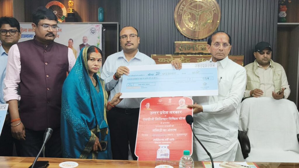 सुलतानपुर विधायक सदर राज प्रसाद उपाध्याय, मुख्य विकास अधिकारी विनय कुमार सिंह की उपस्थिति में नवीन सभागार, कलेक्ट्रेट में आयोजित कार्यक्रम में होली के शुभ अवसर पर प्रधानमंत्री उज्ज्वला योजना के अंतर्गत सुलतानपुर के पात्र लाभार्थियों को गैस सिलेंडर वितरण कार्यक्रम का आयोजन किया गया। जिला खाद्य पूर्ति अधिकारी द्वारा विधायक सदर, मुख्य विकास अधिकारी का पुष्प गुच्छ देकर स्वागत किया गयातत्पश्चात कार्यक्रम का प्रारम्भ मुख्यमंत्री, उ0प्र0 शासन जी द्वारा महिला सशक्तीकरण अभियान, उज्जवला से बना ऊर्जावान होली के शुभ अवसर पर प्रधानमंत्री उज्ज्वला योजना के अंतर्गत 1,500 करोड़ की धनराशि से उत्तर प्रदेश के 1.86 करोड़ उज्ज्वला परिवारों को रसोई गैस सिलेंडर रिफिल सब्सिडी का वितरण कार्यक्रम का लखनऊ से सजीव प्रसारण देखा व सुना गया। तदोपरान्त मा0 विधायक सदर व मुख्य विकास अधिकारी महोदय द्वारा प्रतीक स्वरूप 5 लाभार्थियों को प्रधानमंत्री उज्ज्वला योजना के अंतर्गत डेमो चेक, सिलेंडर का वितरण किया गया। पात्र लाभार्थियों के नाम निम्न हैंः-श्रीमती सरोज गुप्ता, श्रीमती शकीला बानों, श्रीमती डाली, श्रीमती किरन कौशल, श्रीमती स्मिता हैं।