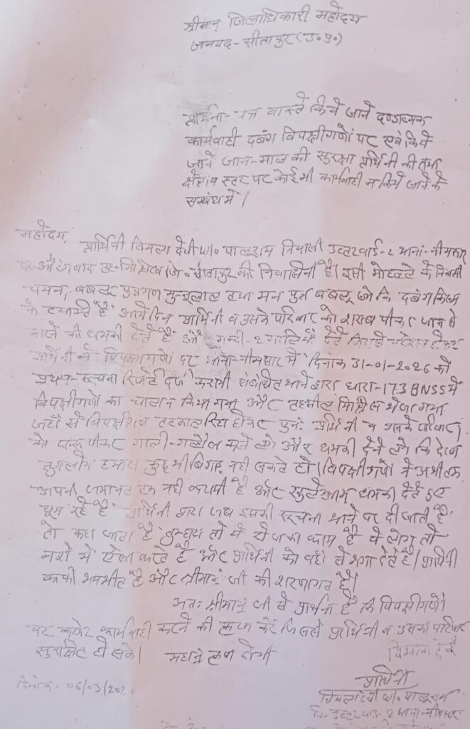 मिश्रित सीतापुर / थाना नैमिषारण्य के उत्तर वार्ड निवासिनी विमला देवी पत्नी पालूराम ने थाना प्रभारी नैमिषारण्य को एक शिकायती पत्र देकर आरोप लगाया है । कि मोहल्ले के ही निवासी चमन , बबलू पुत्र गण मुन्नूलाल तथा मन पुत्र बबलू जो दबंग किस्म ब्यक्ति हैं । पीड़िता के परिवार को आए दिन परेसान किया करते है । दिनांक 31 मार्च को पीड़िता के दरवाजे पर आकर अश्लील गालियां देते हुए कार शीशा तोड़ डाला । पीड़िता द्वारा विरोध करने पर सभी आरोपी गंदी-गंदी गालियां देते हुए लाठी डंडो से मारपीट करने लगे । इस मार पीट के दौरान पीड़िता के बेटे कल्लू की उंगली में काफी चोट आई है । आरोप है कि आरोपी चमन दारू के नशे में धुत होकर आए दिन पीड़िता व उसके परिवार को गाली गलौज करके परेशान करता रहता है । इस लिए पीड़ित ने मांमले का शिकायती पत्र थाना प्रभारी को दिया था । जिस पर उन्होंने सभी आरोपियों के विरुद्ध अपराध पंजीकृत करके उपजिलाधिकारी न्यायालय को चालान भेज दिया था । पीड़िता का आरोप है । कि सभी आरोपी जब वहां से जमांनत पर रिहा होकर आए हैं । तबसे पुनः प्रार्थिनी व उसके परिवार को शराब पीकर गाली गलौज व मार डालने की धमकी देते हुए परेशान कर रहे हैं । इस लिए पीड़ित महिला ने जिलाधिकारी को मांमले का शिकायती पत्र देकर आरोपियों के विरुद्ध कठोर कार्यवाही करने की मांग की हैं ।