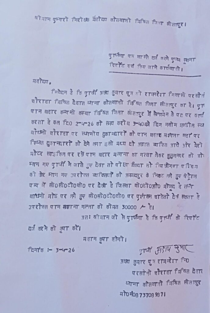 मिश्रित सीतापुर / कोतवाली मिश्रित के परसौली चौराहा मिश्रित देहात निवासी अक्षय कुमार पुत्र राम नरेश ने प्रभारी निरीक्षक एक शिकायती पत्र देकर आरोप लगाया है । कि वह पान बहार पान मसाला के सेल्समैन का कार्य करता है बीते दिवस समय करीब 3:40 बजे नवीन गल्ला मंडी से आगे स्थित बौधनी चौराहा के दुकानदारों को मोटर साइकिल पर पान माशाला का गात्ता रखकर पान बहार पैकेट देने लगा । इसी बीच पीछे दो अज्ञात व्यक्ति मोटर साइकिल पर सवार होकर आए और पान मसाला का गत्ता तथा उसमें रखे पैसे लग भग 30 , 000 रुपए उड़ाकर चंपत हो गए । पीड़ित दुकानदार ने टप्पेबाजों का पीछा भी किया । लेकिन वह चकमा देकर किसी अन्य रास्ते से निकल गए । पीड़ित ने अमजदपुर के निकट लगे पेट्रोल पंप के सीसीटीवी कैमरे पर गत्ता लेकर भागते हुए देखा हैं । जिसकी फुटेज पीड़ित के पास मौजूद है । वहीं बौधनी मोड़ पर लगे सीसीटीवी कैमरे में भी घटना की फुटेज देखी जा सकती है । पीड़ित ने मांमले का शिकायती पत्र प्रभारी निरीक्षक को देकर अज्ञात टप्पे बाजो के विरुद्ध कार्यवाही करने की मांग की हैं ।